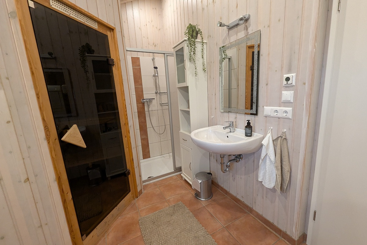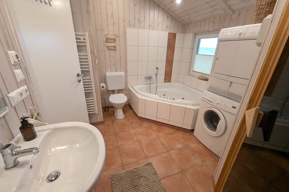 Unser Bad ist etwas Besonderes, auf das wir sehr stolz sind: Es ist eine kleine Wellness-Oase. Die Highlights sind die Sauna für bis zu ca. vier Personen und der Whirlpool. Wir stellen Ihnen für die Nutzung im Haus ebenfalls Bade- und Handtücher zur Verfügung. Nutzen Sie diese bitte ausschließlich im Haus, nicht im Garten und auch nicht am Strand.