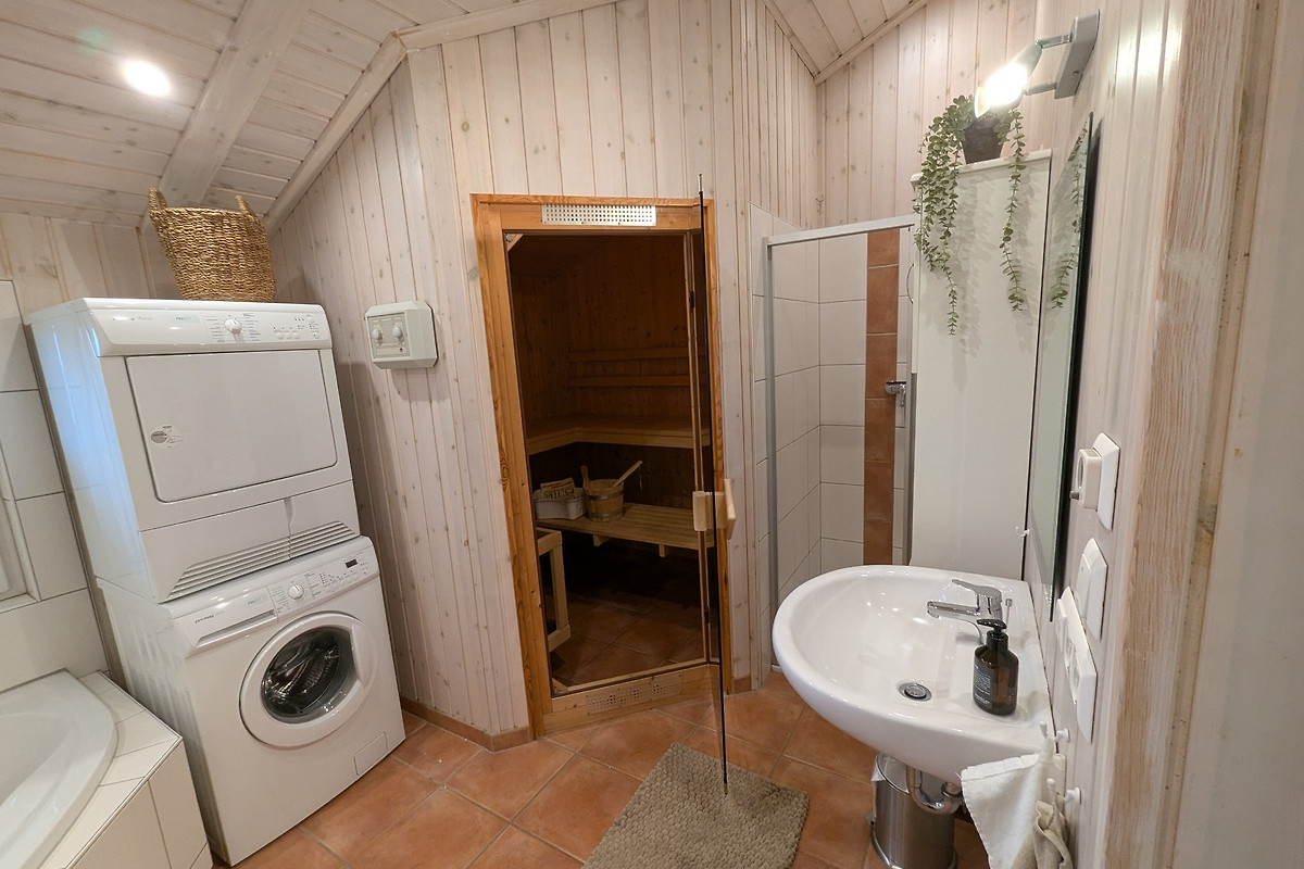 Im Bad befinden sich die Waschmaschine und der Trockner. Diese können Sie selbstverständlich nutzen. Nach Gebrauch reinigen Sie jedoch bitte die Flusensiebe und lassen die Türen zum Trocknen der Maschinen geöffnet.